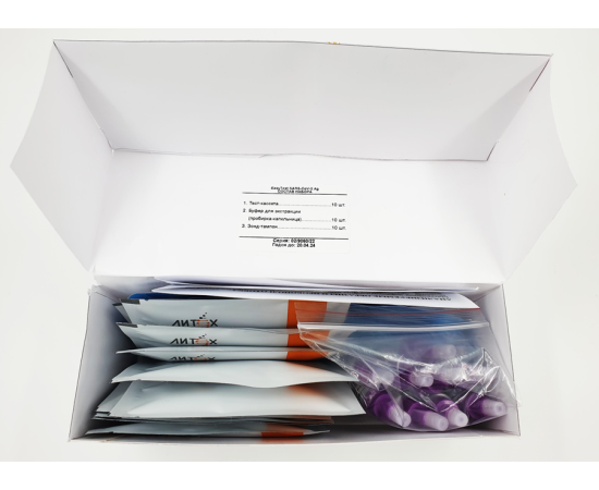 | Набор реагентов для выявления антигена коронавируса SARS-CoV-2 методом иммунохроматографии EasyTest SARS-CoV-2 Ag, 10 тестов | Тест-кассета - 10 шт, буфер для экстракции в пробирке-капельнице - 10 шт, зонд-тампон - 10 шт | 10 | IVD |